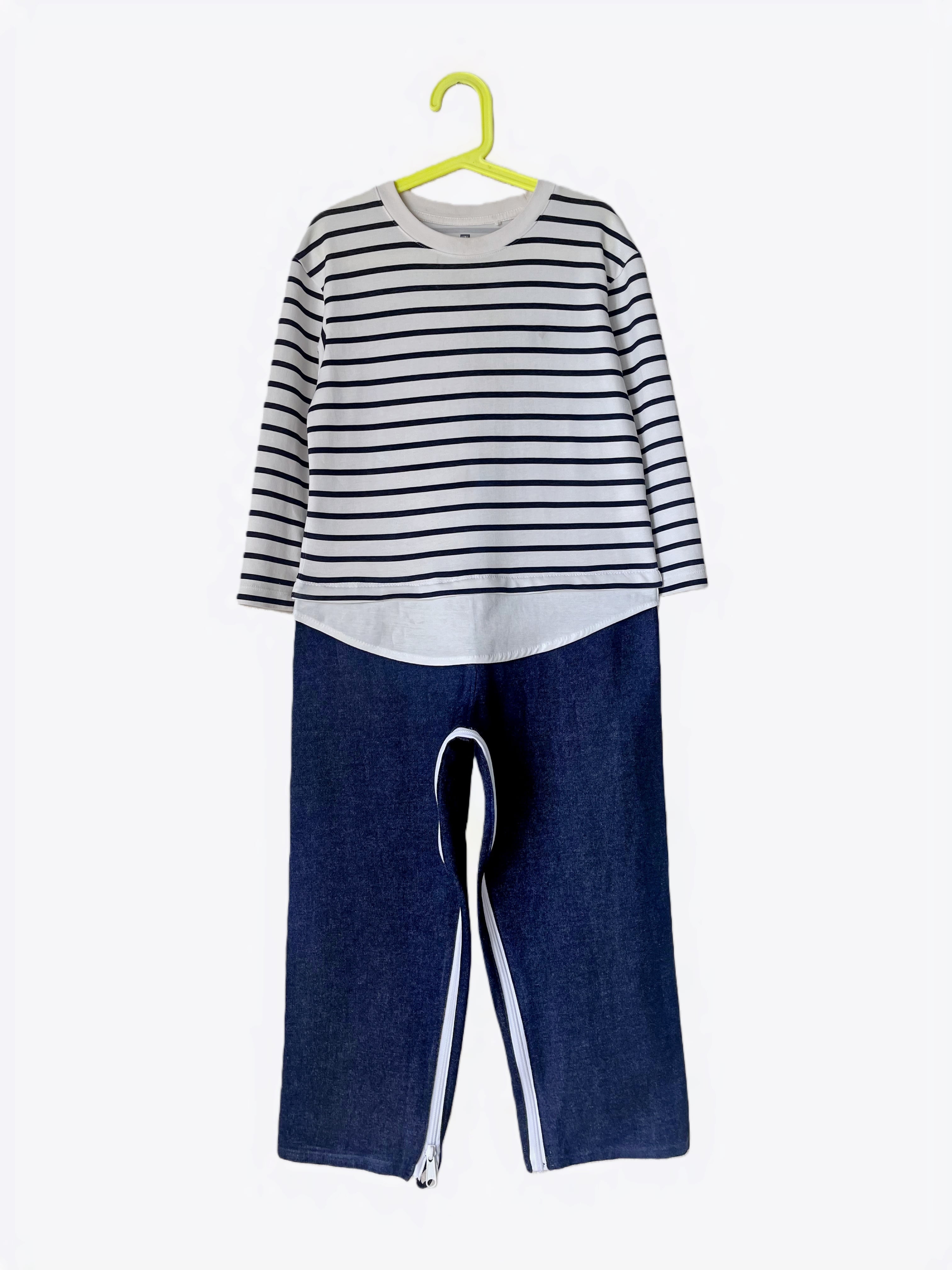 Tシャツとズボンを縫い付け一体化する事で、物理的に下半身をさわれないようにしました。